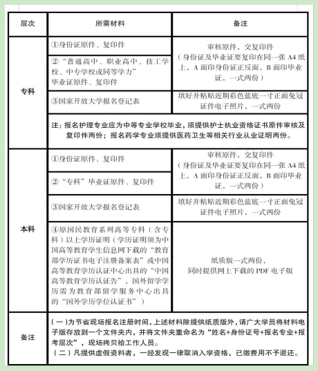 【查驗證件】——【填寫國家開放大學報名登記表(也可提前自行下載打印電子版填好)】——【在“國家開放大學統(tǒng)一身份認證平臺”錄入報名信息】——【打印報名信息表后本人核對簽字確認】——【掃碼采集新生照片】——【在線繳費(具體學費以山東開放大學開放教育在線繳費平臺為準,屆時如繳費系統(tǒng)不開放,繳費事宜則另行通知)】——【掃碼加入新生微信群】